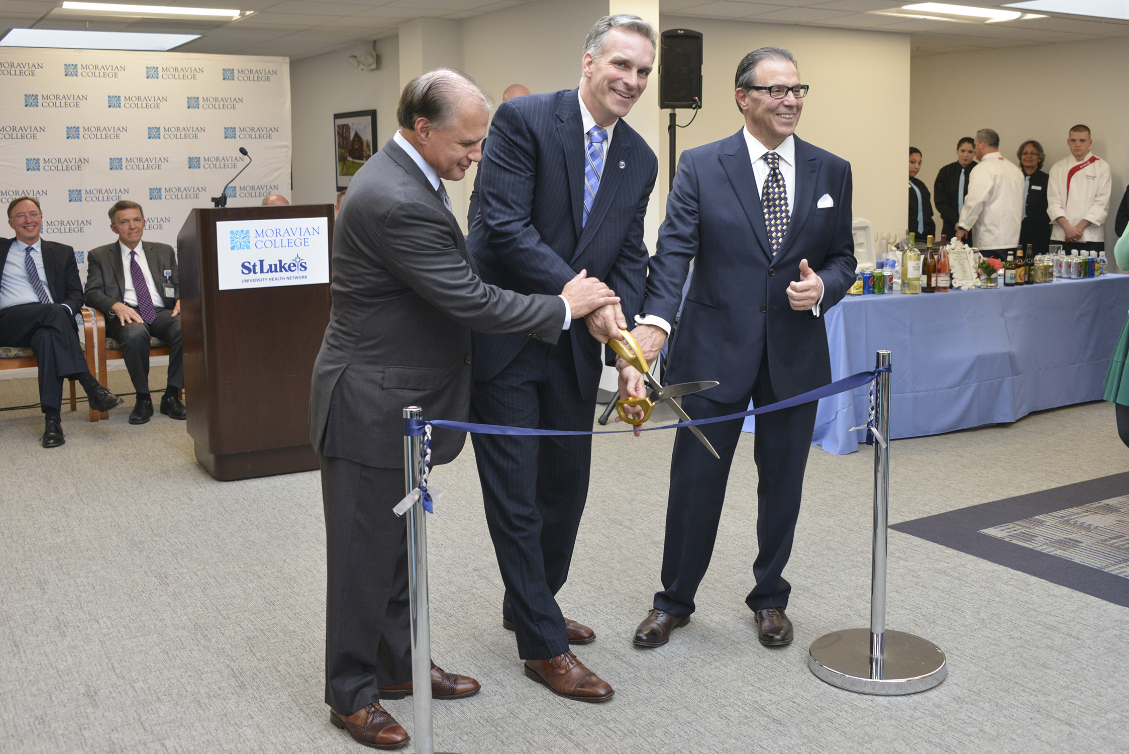 | Ken Rampolla, Chair of the Joint Board of Trustees for Moravian College; Dr. Bryon Grigsby, President of Moravian College; and Richard A. Anderson, President and CEO of St. Luke’s University Health Network cut the ceremonial ribbon. |