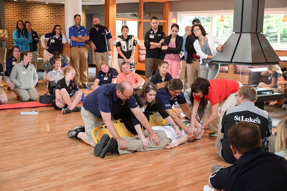 Proper care of sports injuries – especially suspected acute spinal cord injuries and concussions – requires continued training. That’s why St. Luke’s University Health Network certified athletic trainers and sports medicine physicians attended a S.M.A.R.T (Sidelines Management Assessment Response Techniques) Workshop at Prosser Auditorium in the Haupert Union Building of Moravian College on August 1.