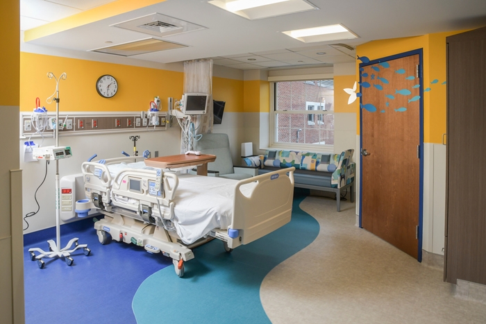Each room is private and spacious with homelike amenities and equipped for parents who need to spend extended periods of time with their children. Each room has video game connectivity, color-changing lights, books and toys for patients. The rooms also have televisions with programming for parents, access to washers and dryers, extra charging ports, showers and a sofa for an “at home” comfortable feeling.