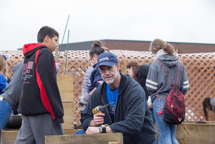 St. Luke’s Todd Nemura with other volunteers building raised garden beds at The Mountain Center in Tobyhanna.