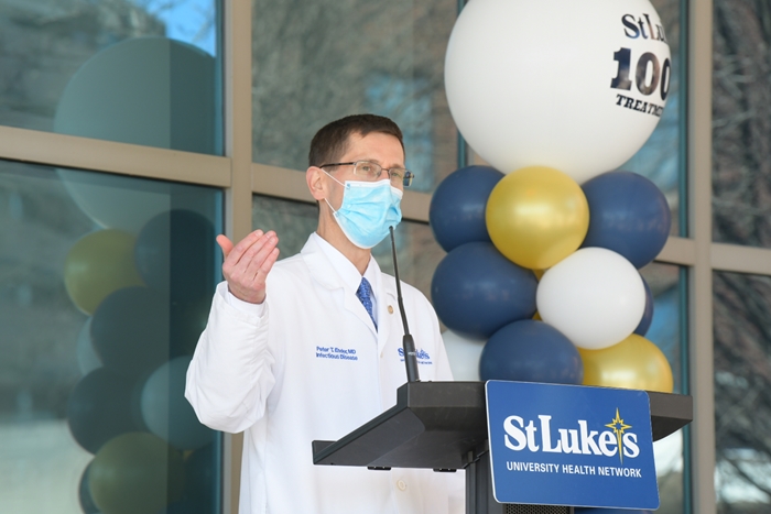 "With the collaborative efforts of many smart and motivated people, this monoclonal infusion program has become incredibly successful in the outpatient care of patients with COVID-19,” said infectious disease specialist Peter Ender, MD, at a news conference at St. Luke’s Easton Campus on Wednesday. Ender oversees St. Luke’s COVID-19 treatment programs. “The logistics were not always easy, but this group has found a way to get it done.”