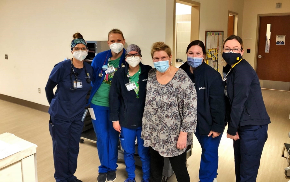 Michele Grida’s caregivers at St. Luke’s Upper Bucks Campus celebrated her survival during Grida’s visit to the hospital to thank the staffs of the ICU and Third Floor. Pictured from left: Brenda Costello, RN, Melissa Juchno, RN, Paige Lieberman, RN, (Grida), Megan Maskornick, RN, and Sharon Michael Rogers, RN.