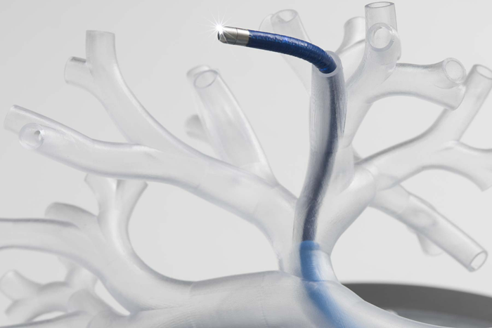 This physician-controlled device includes a long, flexible camera affixed to an extending arm, which is inserted into a patient’s lung to reach the suspicious mass for sampling. Working at a remote console near the patient in the operating room, the physician operates the bronchoscope by manipulating a joy-stick-like controller. At the tip is a camera, light and working channel to pass through tiny instruments that can remove a small sample of tissue even in the deepest areas of the lung.