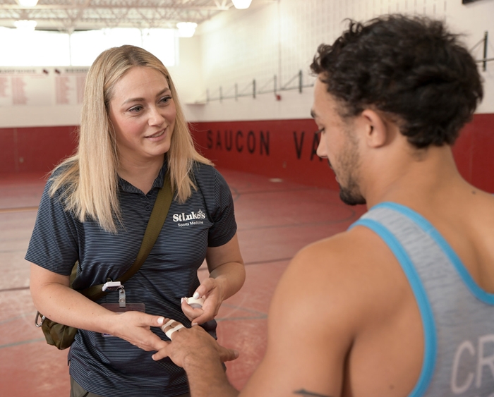 Shelby Hoppis, Lead Athletic Trainer for St. Luke’s University Health Network, tapes the fingers of wrestler Darian Cruz of Allentown.