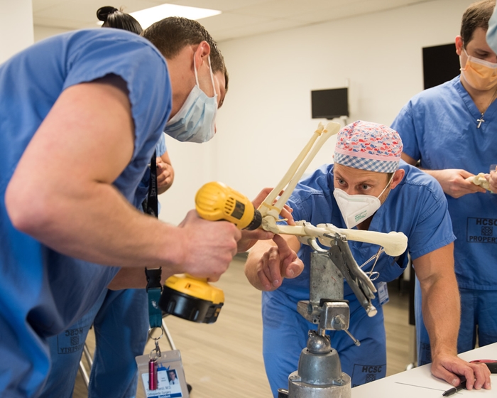 Practicing surgical skills on 3D-printed bones made by St. Luke’s Simulation Center.