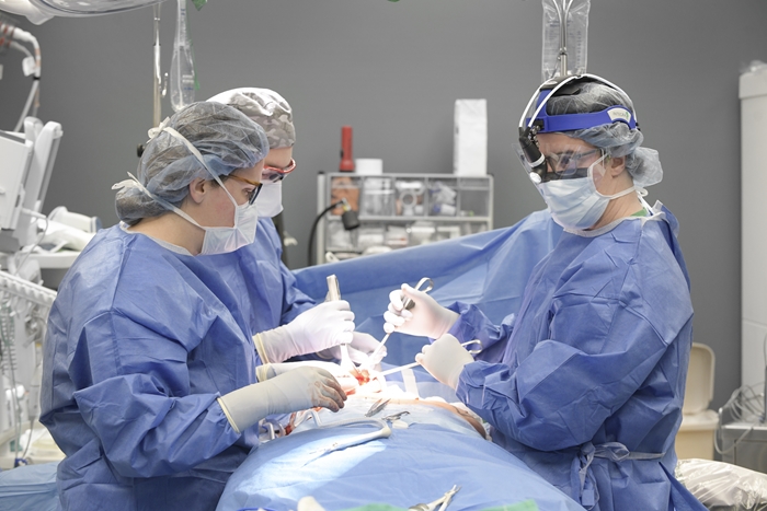Dr. Ali Butash, Temple Plastics Resident Joseph Costa, and Dr. Christopher Sanders perform a double mastectomy and reconstruction at the Carbon Campus.