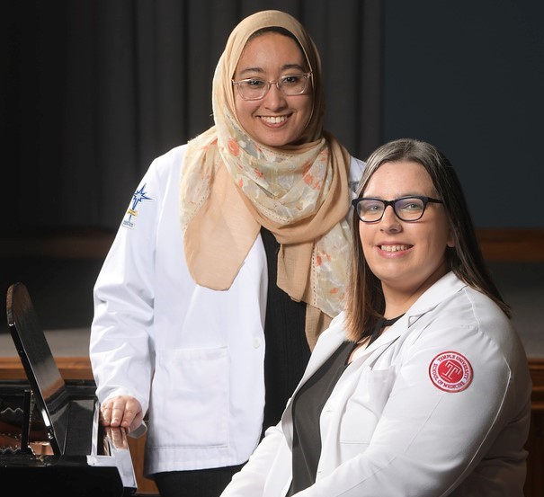Kelly Riccio, seated at the piano, and Rana Moawad, who is Riccio’s former student and current classmate.