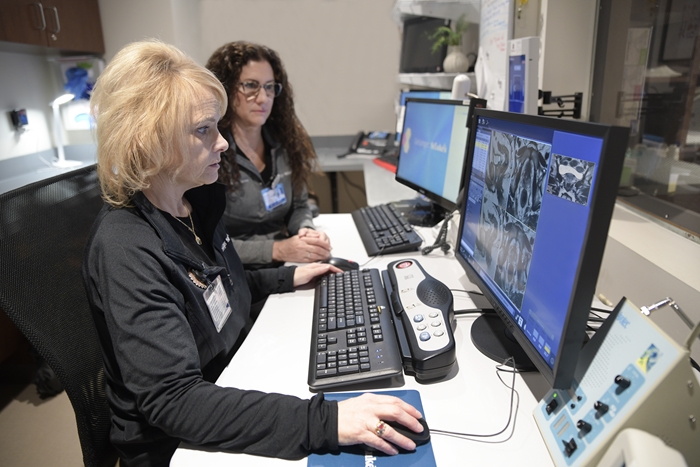 Shelly Stellar, R.T(MR), foreground, and Sheila Mashack R.T.(R)(MR), background, man the controls of the Geisinger St. Luke's Revolutionary Deep Learning MRI Technology from GE Healthcare. Equipped with its deep-learning reconstruction technology algorithm, GE Healthcare’s Air Recon DL technology with MR30 software delivers enhanced clarity of images while reducing scan times for the comfort of patients. Geisinger St. Luke's Hospital is the fifth hospital in the world to offer this technology.