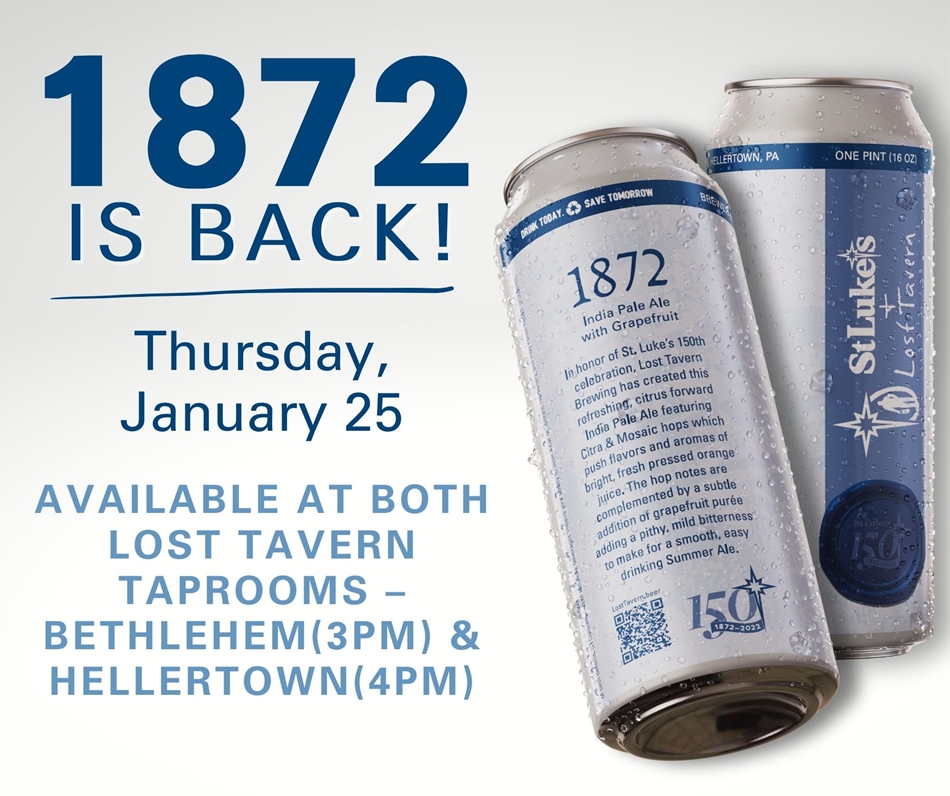 For the third year in a row, Lost Tavern Brewing of Hellertown is releasing 1872, its New England-style hazy IPA, first released in 2022 to help celebrate the 150th anniversary of St. Luke’s.