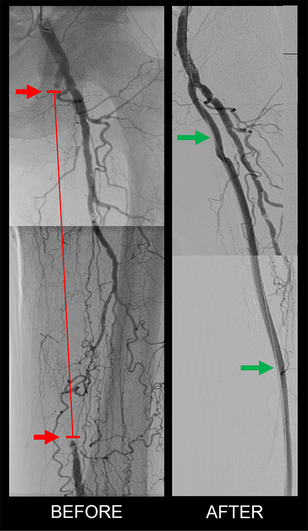 Peripheral arterial disease is a narrowing or total blockage in the leg that affects about 12 to 19 million Americans. This condition occurs over time due to various risk factors such as smoking, diabetes, high blood pressure and cholesterol that cause fatty deposits in the wall of the blood vessel. These same risk factors can also narrow blood vessels in other parts of the body such as the heart, neck, brain, kidney and intestines. Cardiovascular disease is the leading cause of death and disability in the United States. In advanced cases, leg blockages can progress into non-healing foot wounds, gangrene, and sometimes lead to partial or complete amputation of the foot or leg.